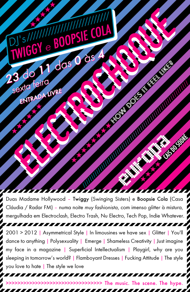 Duas Madame Hollywood – Twiggy (Swinging Sisters) e Boopsie Cola (Casa Cláudia / Radar FM) – numa noite muy fashionista, com imenso glitter à mistura, mergulhada em Electroclash, Electro Trash, Nu Electro, Tech Pop, Indie Whatever.