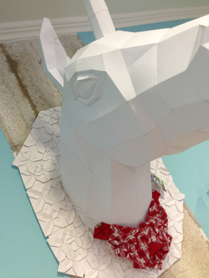 Colar de origami em tecido (Orinuno) + caixa origami Amores de Tóquio – €35. Escolhi como expositor desta colecção na loja este unicórnio paper head trophy´s do Paper Wolf via Etsy.com – €48. O modelo é criado em computador, só necessitam de cola e paciência para colarem este modelo que é enviado com peças pré cortadas. Mais animais disponíveis.