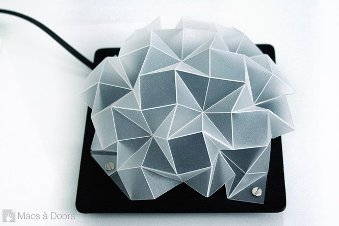 Candeeiro em polipropileno com base metálica – €70 na Mãos à Dobra; marca e loja no Largo dos Trigueiros 16B. Também fazem workshops de origami